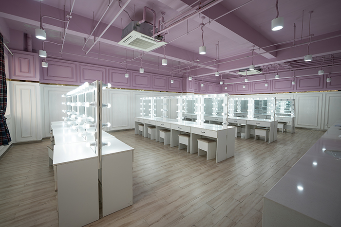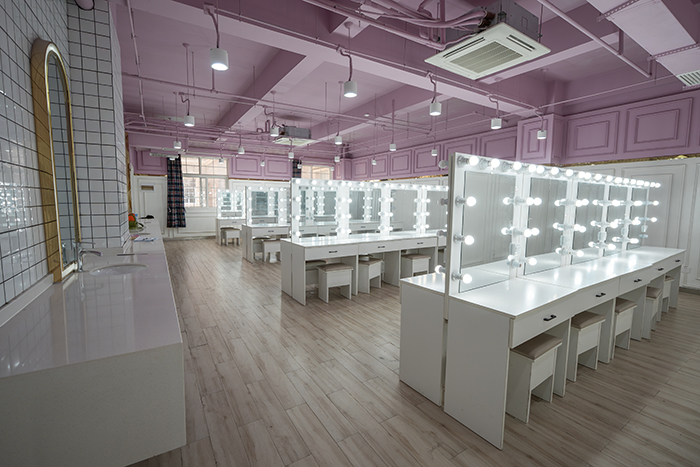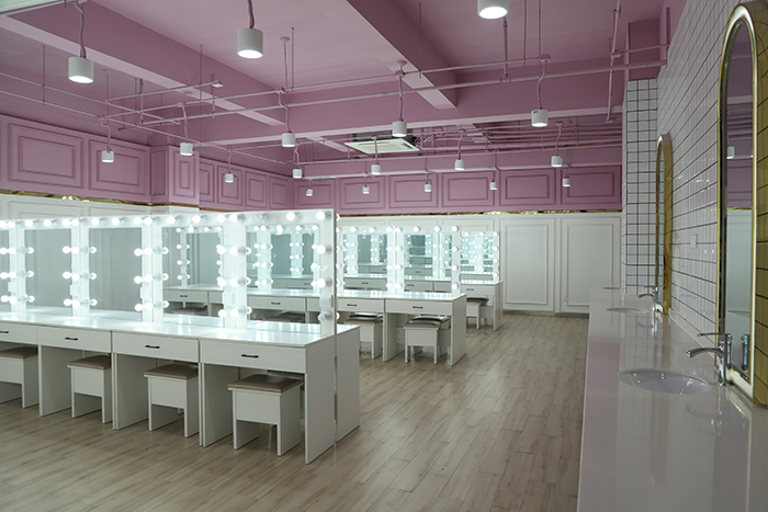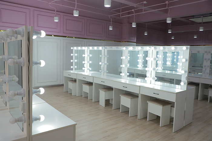 形象设计与化妆实训室。此间实训室占地面积约86平,可容纳30名学生进行教学实训,专供化妆美容使用。化妆台由化妆镜、化妆台面、化妆椅及相应的灯具构成。化妆镜通常较大,使化妆者清楚地看到自己脸部的各个地方。化妆镜专用照明灯装在镜子两边。