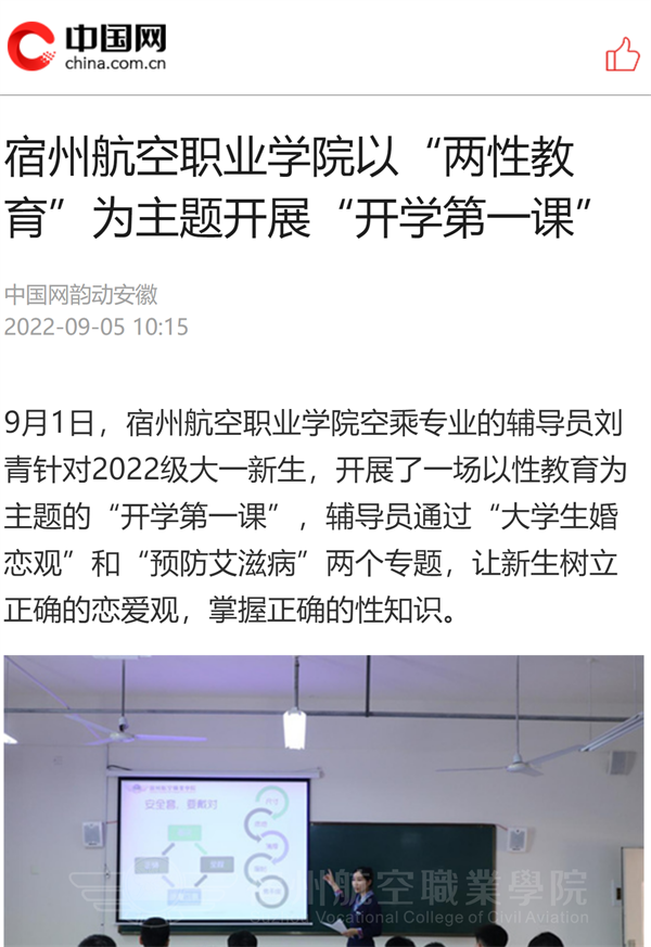 9月1日,彩神空乘专业的辅导员刘青针对2022级大一新生,开展了一场以性教育为主题的“开学第一课”,辅导员通过“大学生婚恋观”和“预防艾滋病”两个专题,让新生树立正确的恋爱观,掌握正确的性知识。