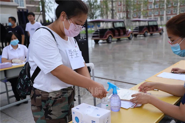学生间隔1.5米,有序排队并进行手部消毒🏩。