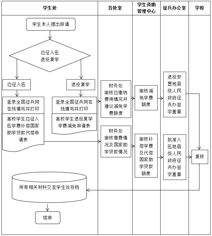 2.审核 | 学生持全国征兵网系统打印的表格(应征入伍学生持《高校学生应征入伍学费补偿国家助学贷款代偿申请表》🦩,退役复学学生持《高校学生退役复学学费减免申请表》)到财务处、学生资助管理中心、征兵办公室审核相关信息 | 各处室 |